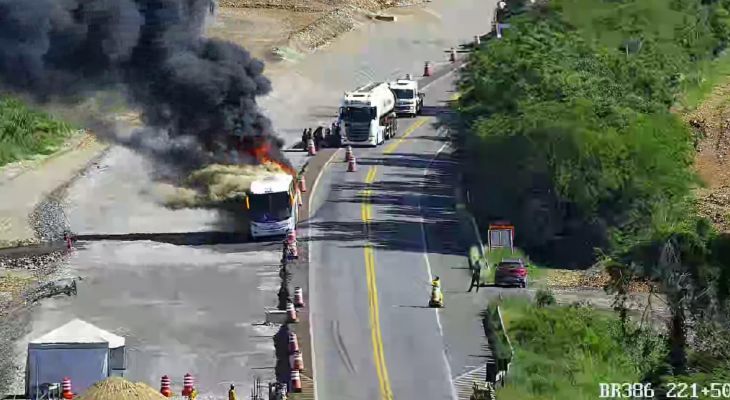 Ônibus pega fogo e causa bloqueio total na BR-386 em Soledade |