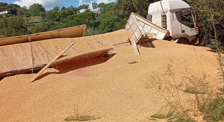 Carreta carregada com milho sai da pista na ERS-324