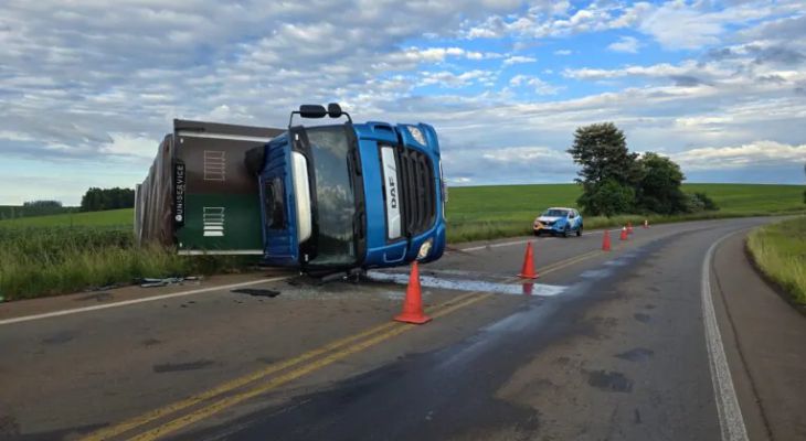 Um acidente ocorrido na madrugada desta terça-feira (17/02) deixou a ERS-324, no trecho entre Pontão e Passo Fundo, bloqueada. O sinistro foi registrado no km 156 da rodovia, onde um caminhão, com placas padrão Mercosul, tombou após o motorista perder o controle do veículo em uma curva.