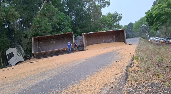 A carreta transportava cerca de 35 toneladas de milho, que ficaram espalhadas sobre a pista e bloquearam parte da rodovia. Ninguém ficou ferido.