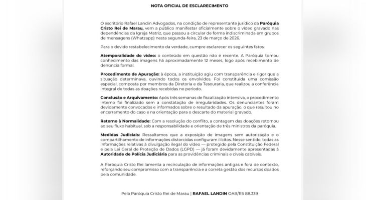 O escritório Rafael Landin Advogados, na condição de representante jurídico da Paróquia Cristo Rei de Marau, vem a público manifestar oficialmente sobre o vídeo gravado nas dependências da Igreja Matriz, que passou a circular de forma indiscriminada em grupos de mensagens (Whatsapp) nesta segunda-feira, 23 de março de 2026.