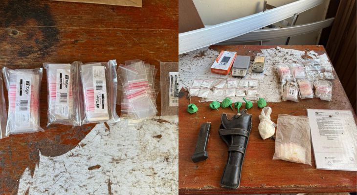 Durante as buscas, os policiais apreenderam cocaína e crack, armas e munições (incluindo munição 9 mm) e materiais usados na traficância, como balanças de precisão e embalagens do tipo ziplock, sendo parte da droga encontrada já fracionada e pronta para venda.